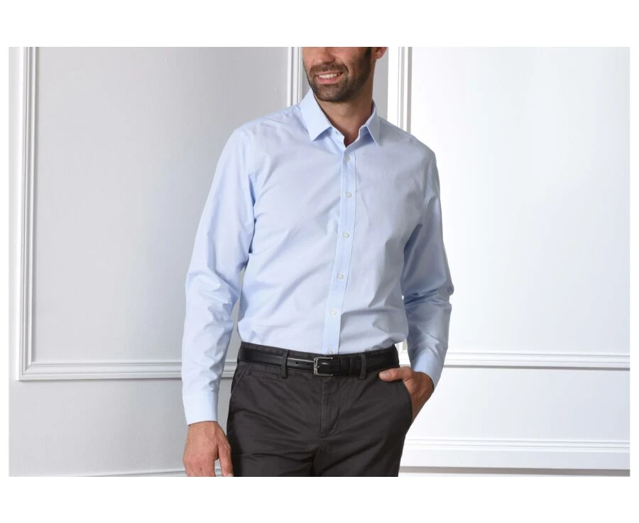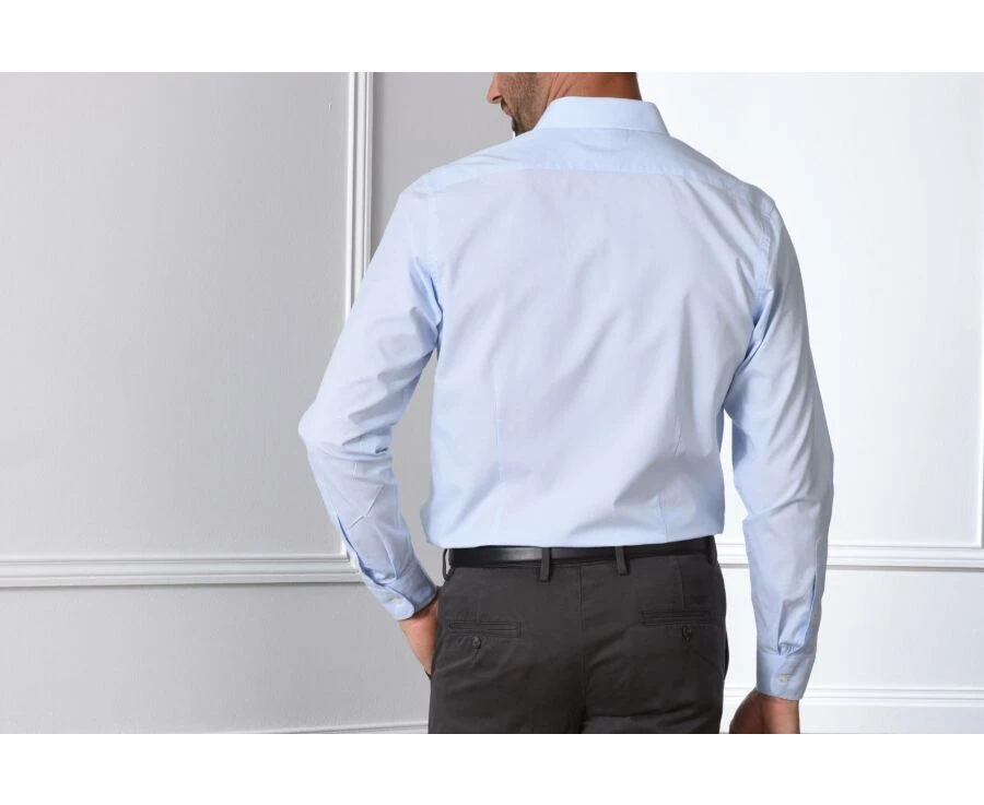 La chemise homme Antoine Bleu clair et blanc est réalisée en popeline 100% coton double fil 115g/m², avec une finition toucher doux.