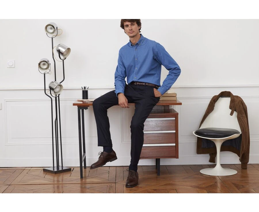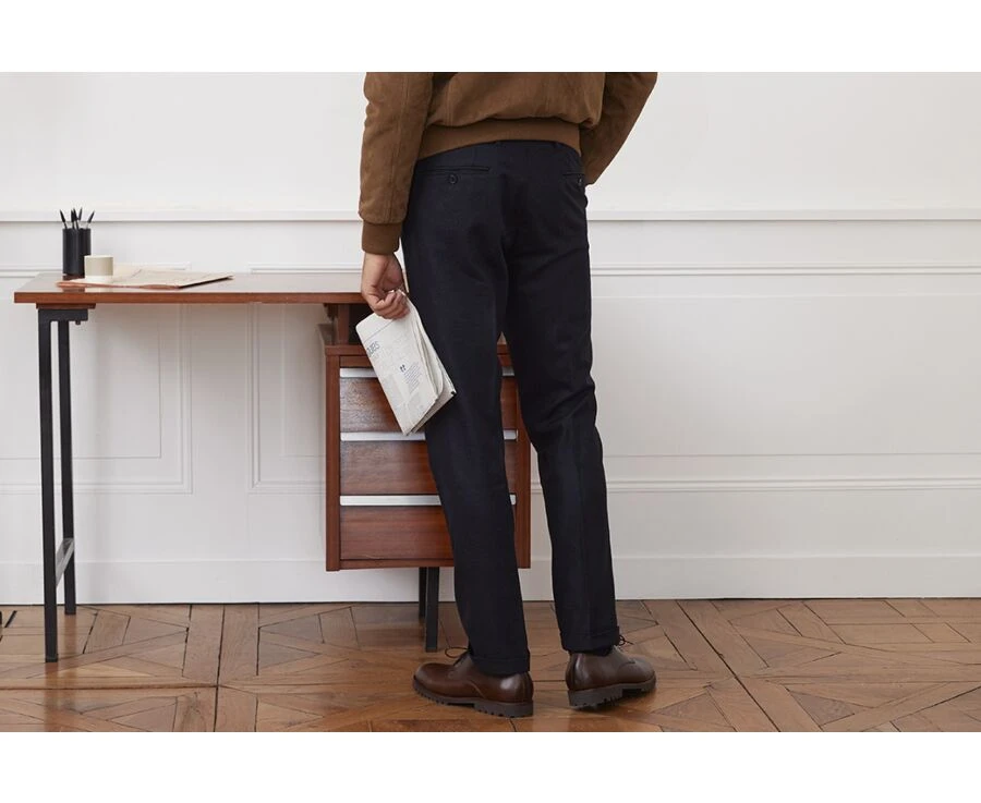 Lélian est un pantalon sans pince pour un style habillé et élégant. Soigneusement confectionné dans un tissu haut de gamme du tisseur portugais Albano Morgado. Cette maison réalise des tissus en laine cardée ou peignée depuis 1927 avec un savoir-faire particulier.