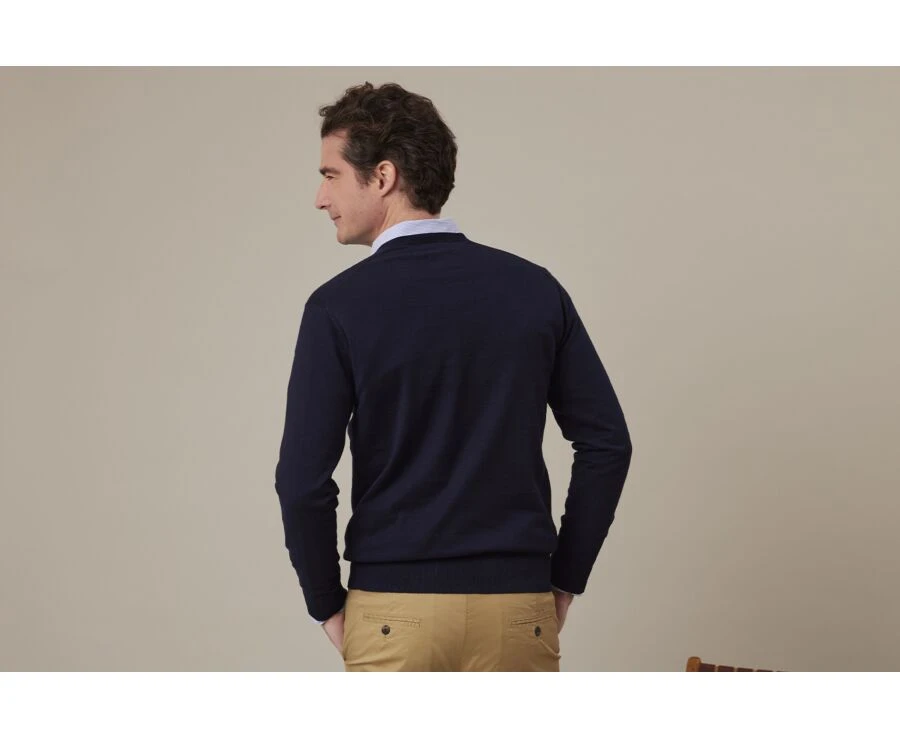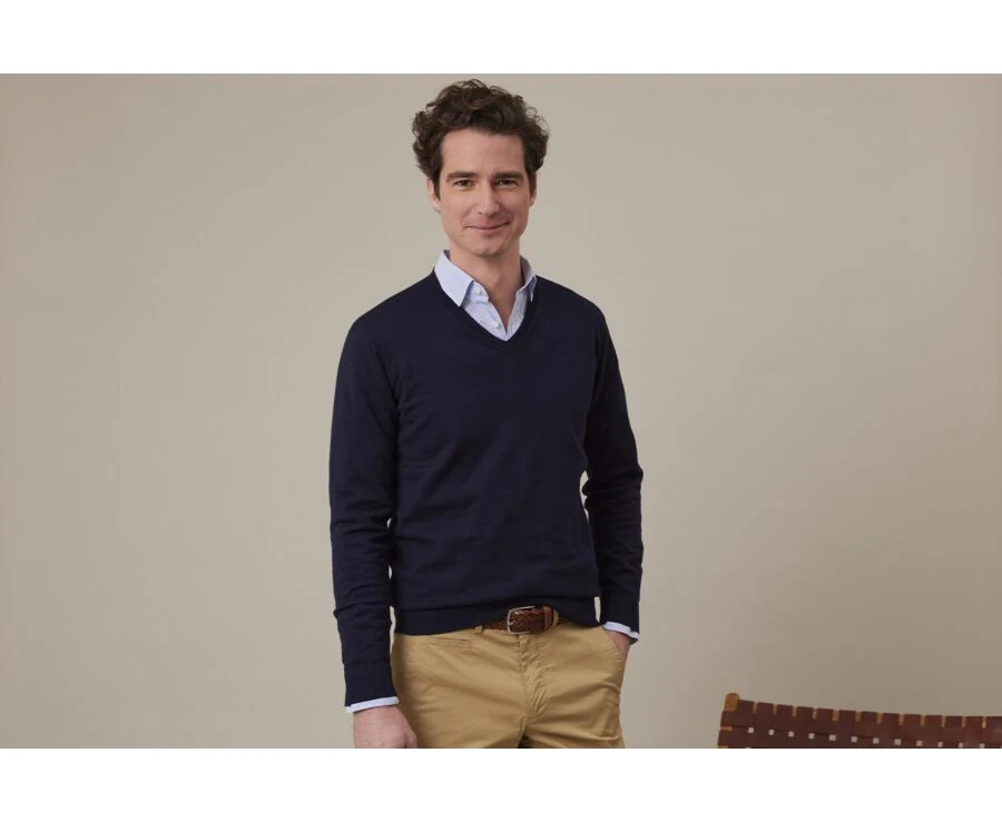 L’élégance intemporelle d’un pull col V toute saison en coton/cachemire double fil.