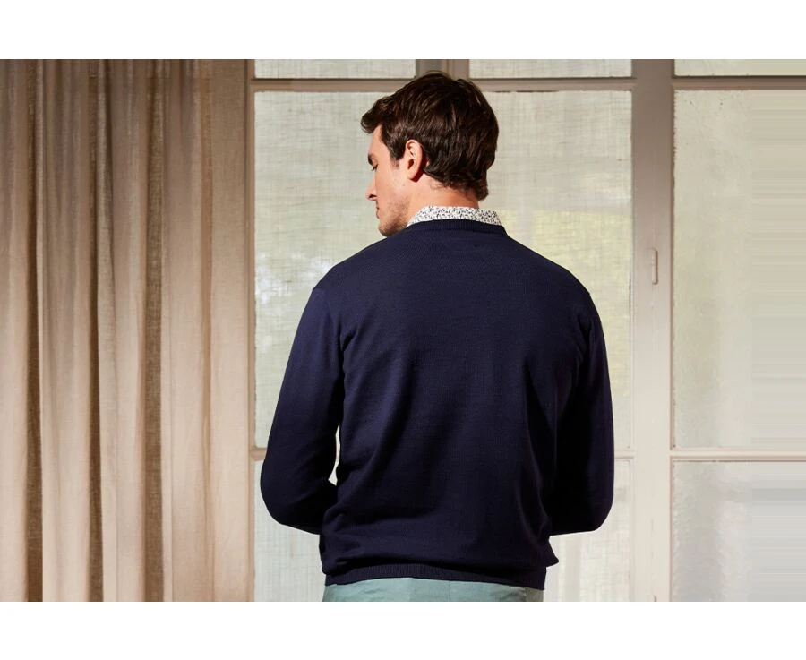 Idéal en toute saison, Vladimir est un pull homme à col rond coupe standard tricoté dans une maille double fil, fine et luxueuse, alliant le coton et le cachemire.