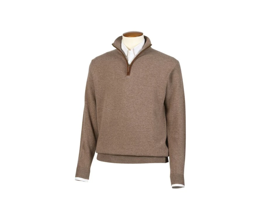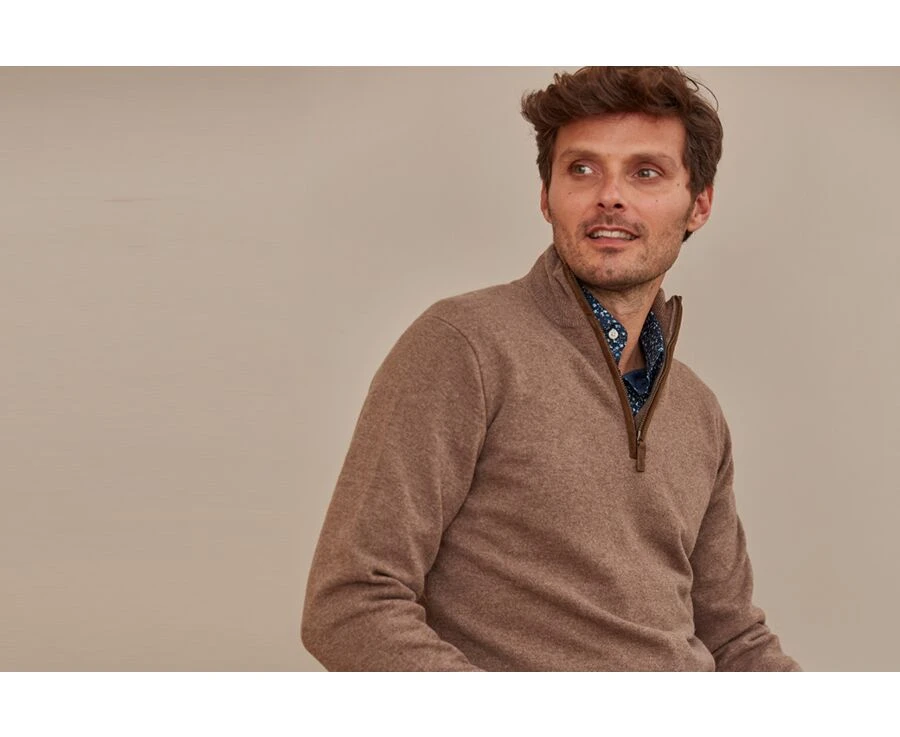 Le pull zippé homme Keithy avec passepoil et tirette en cuir vous accompagnera avec élégance. Idéal à porter avec une chemise.