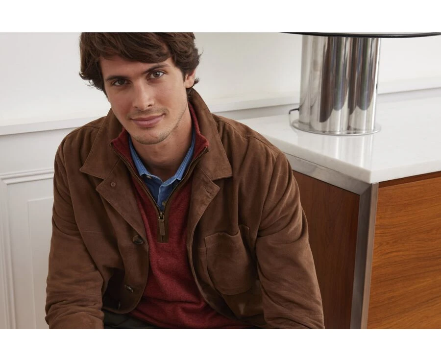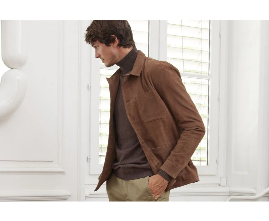 Faustin est une veste en peau souple et confortable, inspirée des vestes de peintre. Idéale pour un look chic et décontracté à la mi-saison, à porter avec un pull ou simplement une chemise légère en cotonnade.